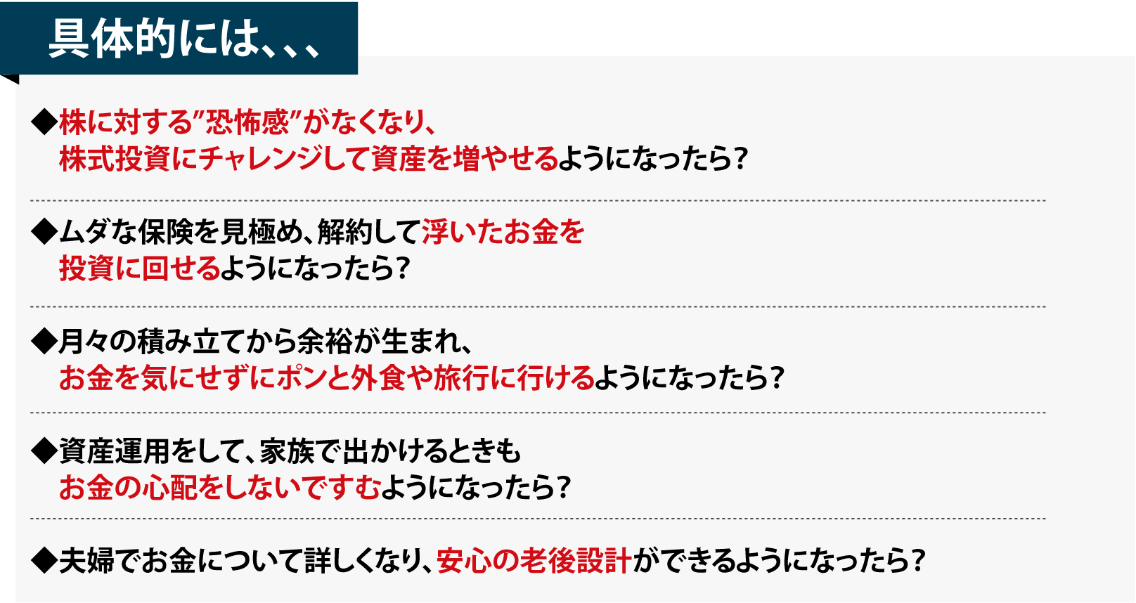 マネーアカデミーでは、「何を勉強したらいいかもわからない」ところから学びをスタートし、具体的に「○○をすれば資産が増える」と自分自身で判断・区別できるようになるまでの正しいお金の知識が学べます。