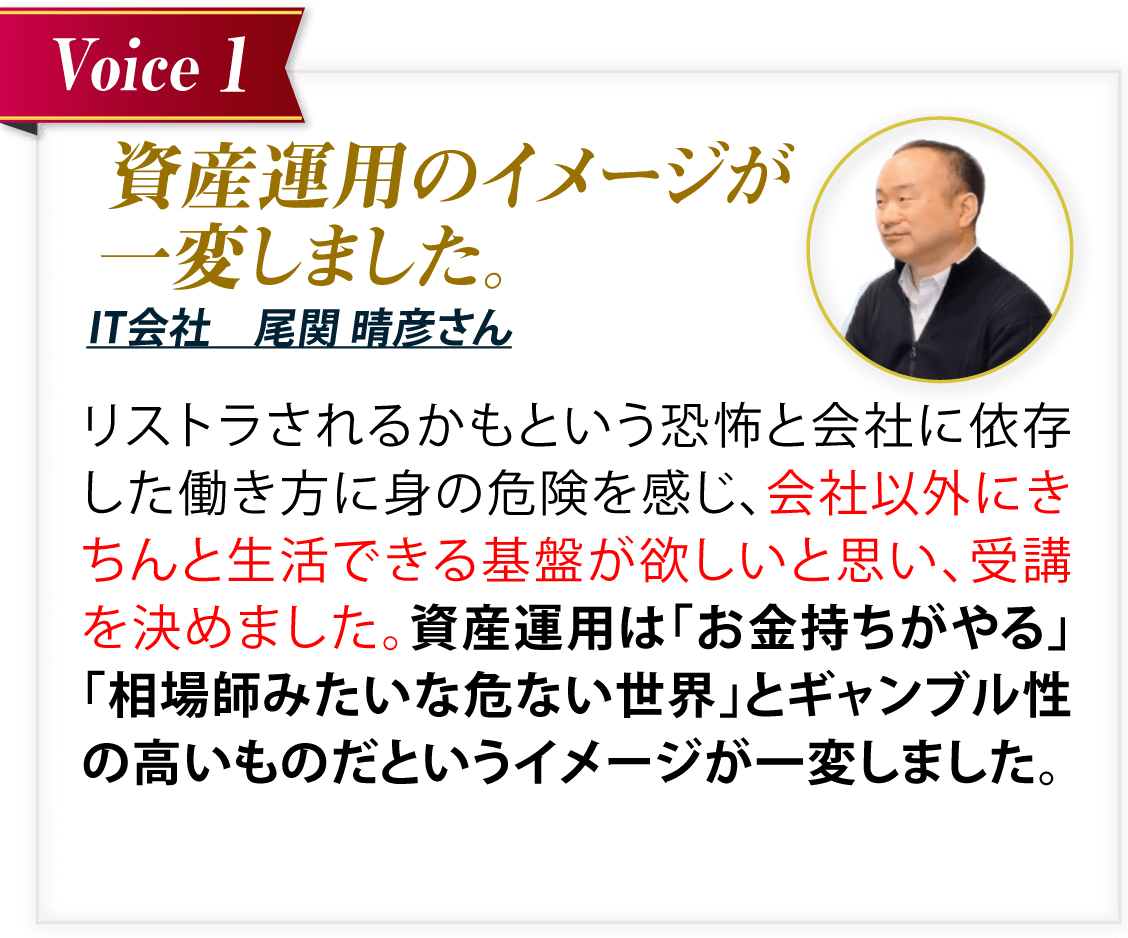 自身がごく普通の会社員だった経験から、大手の金融出身者と違い、相手の身の丈にあった資産運用の方法やわかりやすく丁寧で誠実なサポートが好評を得ている。