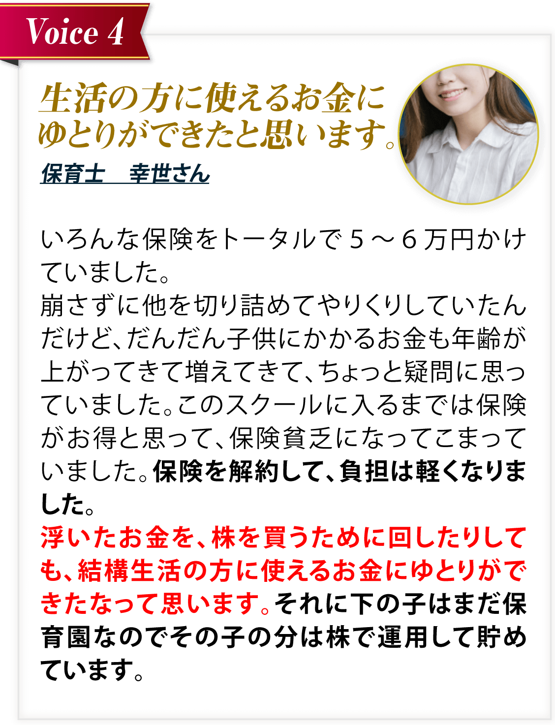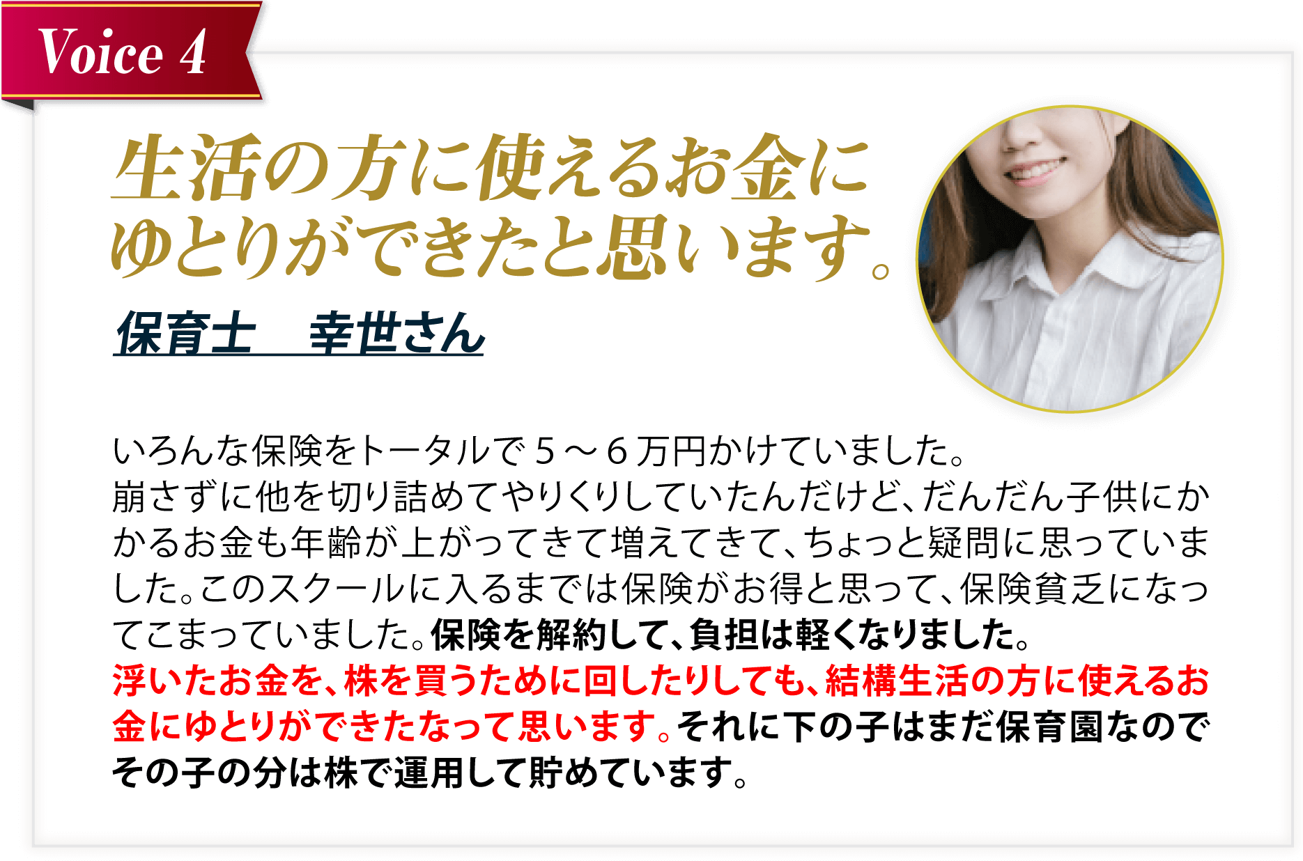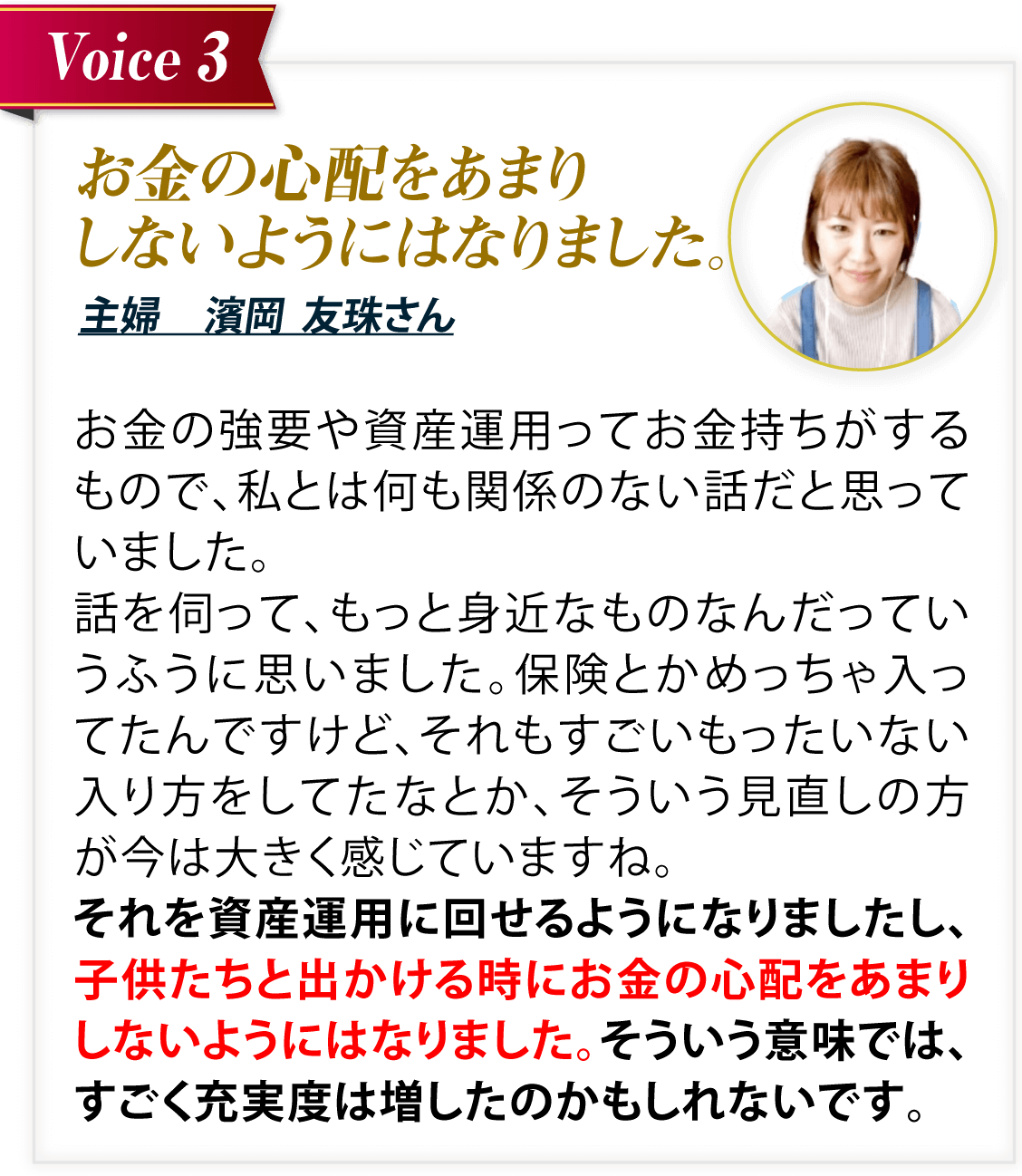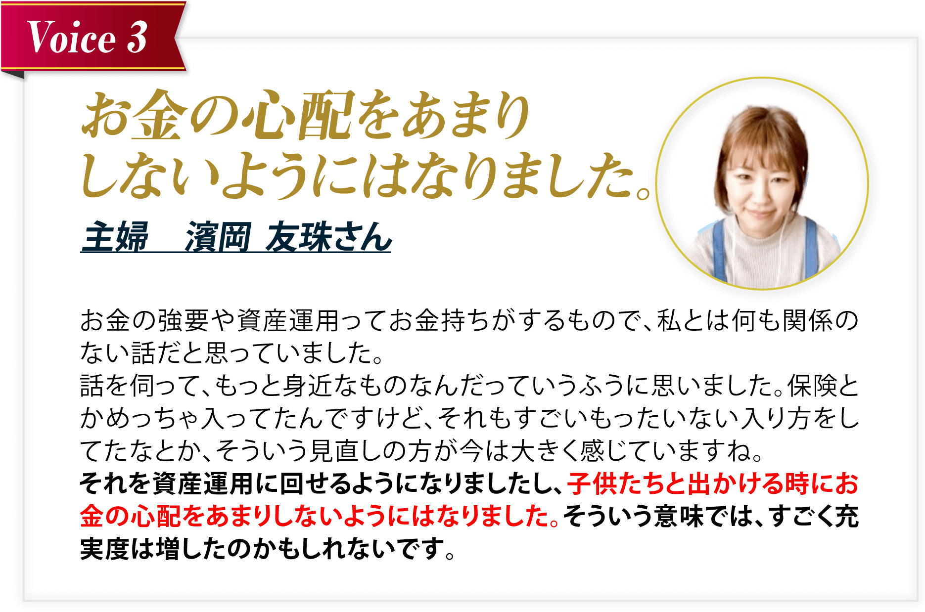 ◆ 今のお給料で、お金を増やせる方法を知らなかったから不安だったんだ