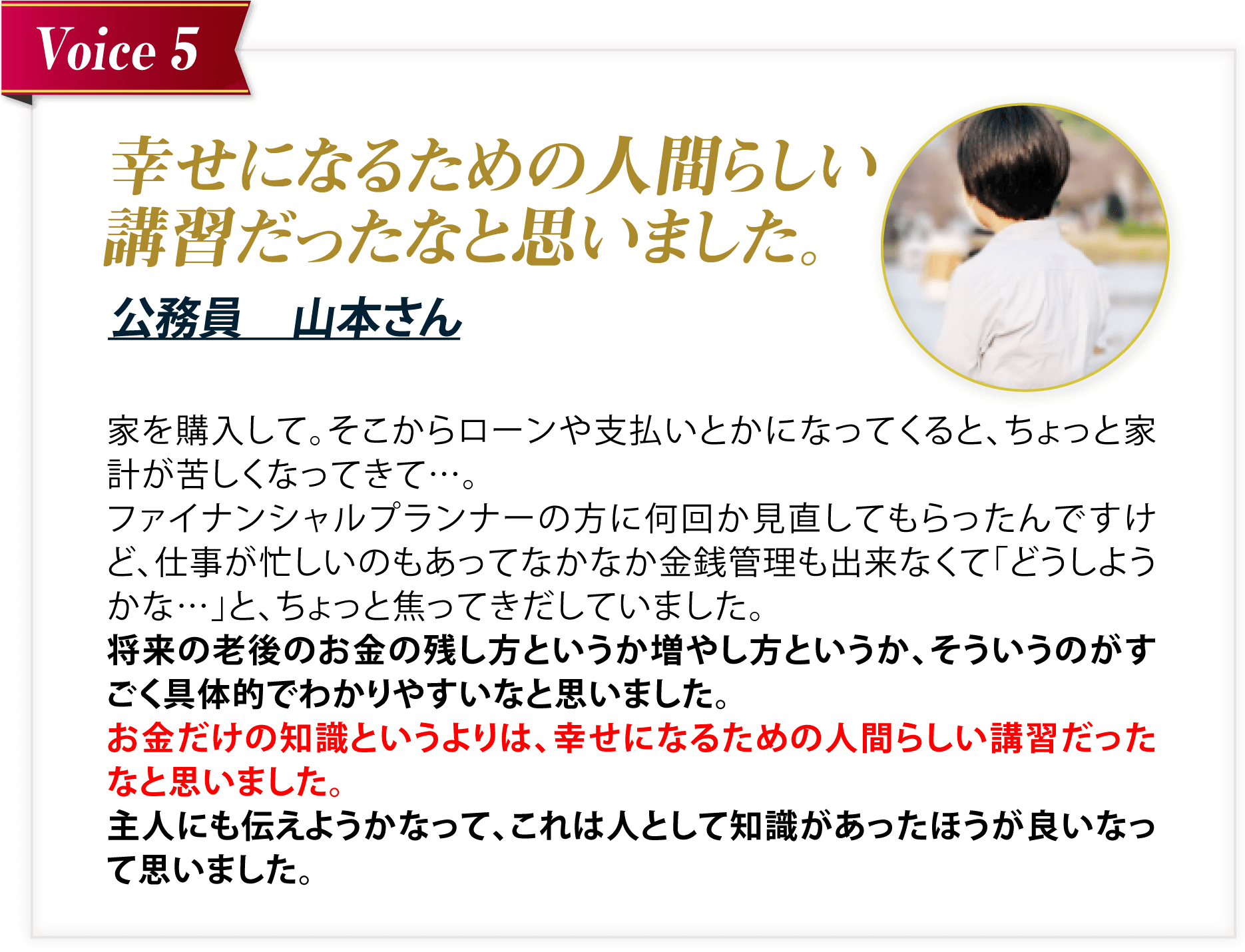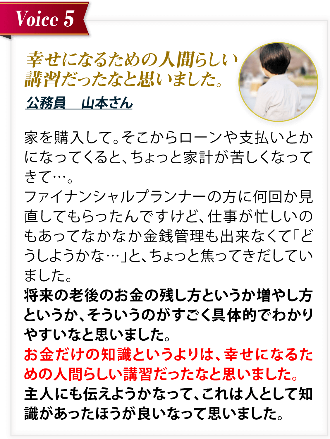 ですから、今後はお金について不安になることもなくなりますし、ヘンな投資商品にダマされることもなくなるでしょう。安定・堅実な方法で資産を殖やし続け、老後も安泰の生活を手に入れられるようになります。